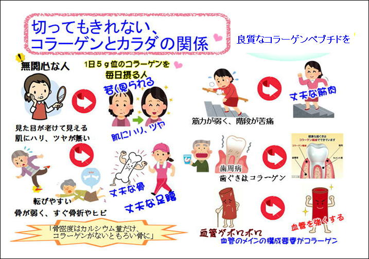 コラーゲンは身体で作られる割合は年齢や乱れた食生活とともに減少してしまいます。 コラーゲンは皮膚の再生、シミ、シワ、の改善、髪質の改善、血管を丈夫にし脳の神経細胞を保護、眼精疲労・ 網膜保護、骨を丈夫に骨粗鬆症対策に関節の痛みの改善、又余分な脂肪を燃やすダイエット効果も 期待されています。