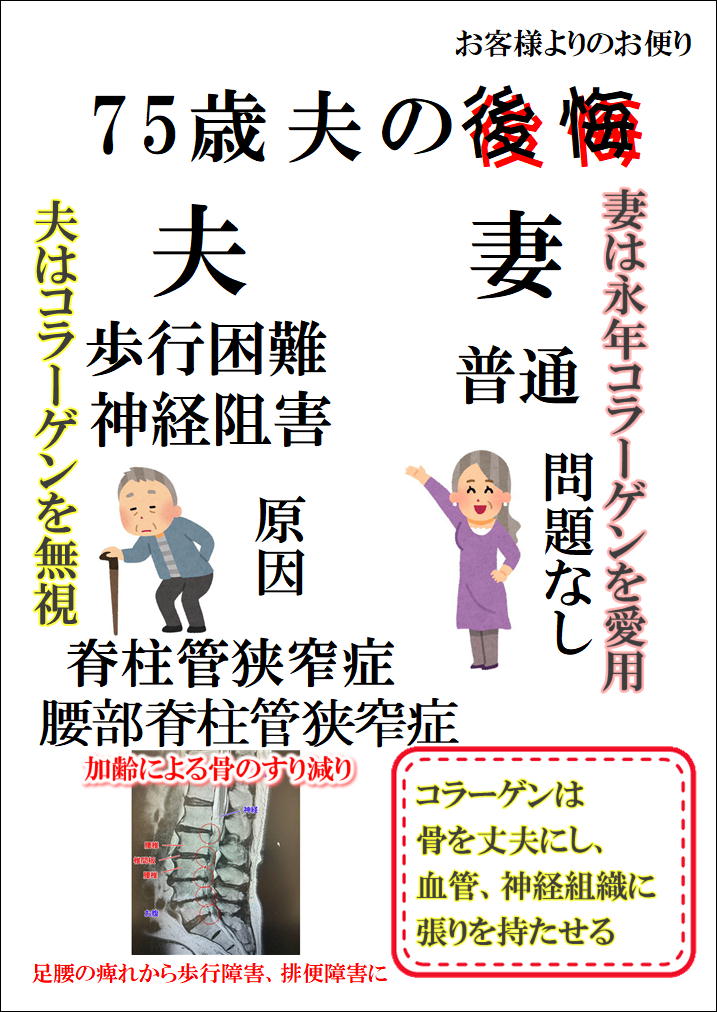 よくコラーゲンを飲み始めて1〜2か月で効果が分からないと飲むのを止めてしまう方が多いのですが、 コラーゲンは長ーくお付き合いをして、結果が身体に良い方向に出るものです。 いつのまにか、他人よりも若く見られる、骨も筋肉もしっかりしている、等 是非、毎日の食生活の習慣として5g位のコラーゲンを 牛乳、ジュース、青汁、ヨーグルト、コーヒー等でコラーゲンの摂取をおススメします。 お料理に、炊飯時に、味噌汁、等に味は変わりなく、自然に摂取できます。。